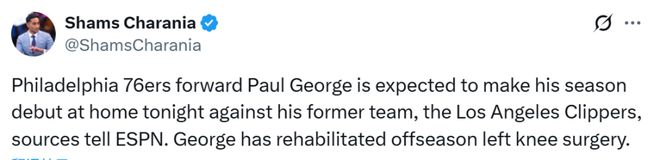 北京时间11月18日,据名记Shams报道,保罗-乔治将在今日对阵快船的比赛中正式复出,完成本赛季的个人首秀。